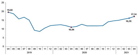 Tüketici Fiyat Endeksi'nde nisan ayında bir önceki aya göre %1,68, bir önceki yılın Aralık ayına göre %5,45, bir önceki yılın aynı ayına göre %17,14 ve on iki aylık ortalamalara göre %13,70 artış gerçekleşti.