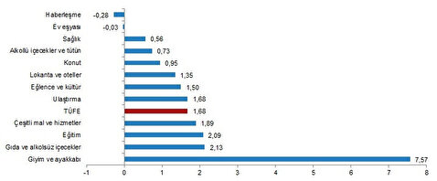 Bir önceki yılın aynı ayına göre artışın düşük olduğu diğer ana gruplar sırasıyla, %9,05 ile haberleşme, %10,21 ile eğitim ve %11,03 ile giyim ve ayakkabı oldu. Buna karşılık, bir önceki yılın aynı ayına göre artışın yüksek olduğu ana gruplar ise sırasıyla, %29,31 ile ulaştırma, %22,27 ile ev eşyası ve %19,20 ile sağlık oldu.