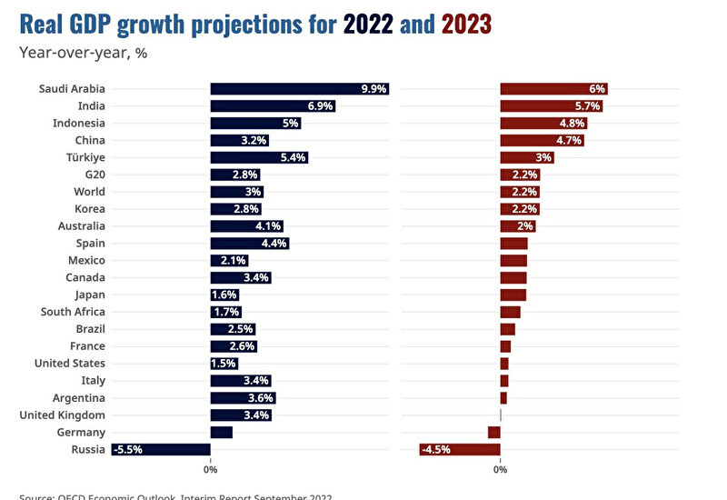 Ekonomik İşbirliği ve Kalkınma Örgütü (OECD), haziranda 2022 yılı için yüzde 3 olarak açıkladığı küresel ekonomide büyüme tahminini sabit tutarken, Türkiye ekonomisine yönelik büyüme beklentisini ise yüzde 3,7’den yüzde 5,4'e revize etti. Öte yandan Avrupa'nın en güçlü ekonomisi olan Almanya için 2022 büyüme beklentisini ise yüzde 1,9'dan yüzde 1,2'e indirdi. OECD, Alman ekonomisinin gelecek yıl yüzde 0,7 daralacağını tahmin etti.