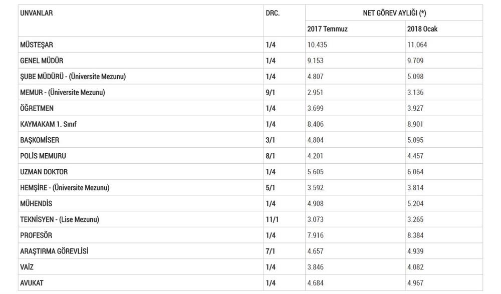 2018 yılı Ocak ayından geçerli olmak üzere, 1/4 derece bir öğretmenin en düşük maaşı 3,699 TL olurken, en yüksek maaş ise 3,927 TL oldu.