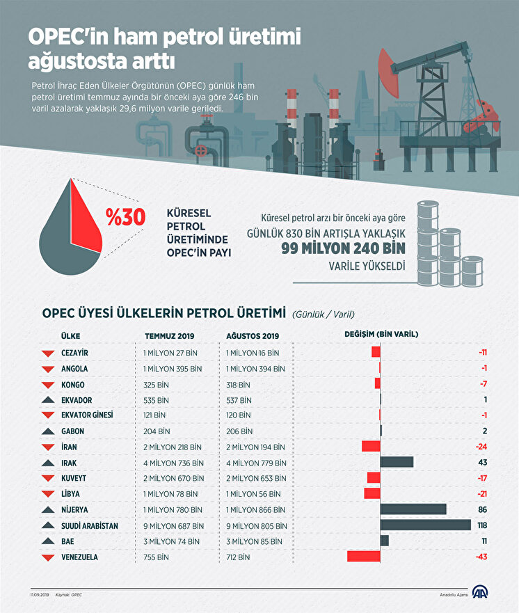 OPEC'in günlük ham petrol üretimi ağustosta bir önceki aya kıyasla 136 bin varil artışla 29 milyon 740 bin varile yükseldi. Bu dönemde OPEC'in, toplam küresel petrol arzı içindeki payı yüzde 30 olarak belirlendi.