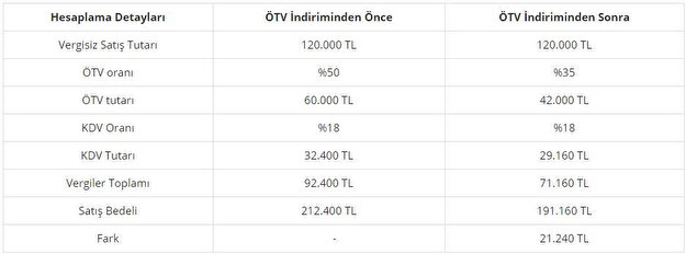 Yıl sonuna kadar sürdürülecek indirimler kapsamında, motor hacmi 1600 cc altında ve ÖTV matrahı 70 bin TL altındaki otomobillere uygulanan yüzde 45 oranındaki ÖTV yüzde 30, 1600 cc altındaki motor hacmine sahip, ÖTV matrahı 70 bin TL ile 120 bin TL aralığında olan otomobillere uygulanan yüzde 50 oranındaki ÖTV ise yüzde 35 şeklinde uygulanıyor.