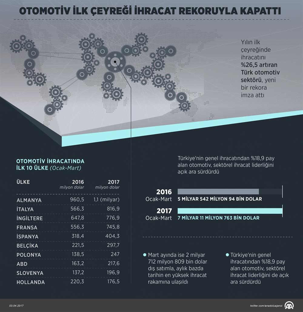 Türkiye İhracatçılar Meclisi (TİM) kayıtlarından derlenen bilgilere göre, otomotiv sektörü, 2016 ocak-mart döneminde 5 milyar 542 milyon 94 bin dolar olan ihracatını, bu yılın aynı döneminde yüzde 26,5 artırarak 7 milyar 11 milyon 763 bin dolara taşıdı.
