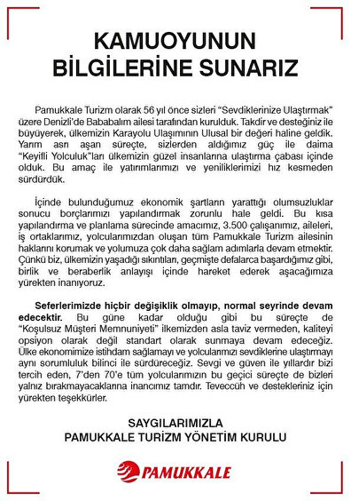 Ekim ayında İzmir Ticaret Mahkemesine başvuran Pamukkale Turizm için üç aylık geçici mühlet kararı verilmiş, kararla birlikte şirket faaliyetlerinin denetimi için de geçici konkordato komiser heyeti atanmıştı.