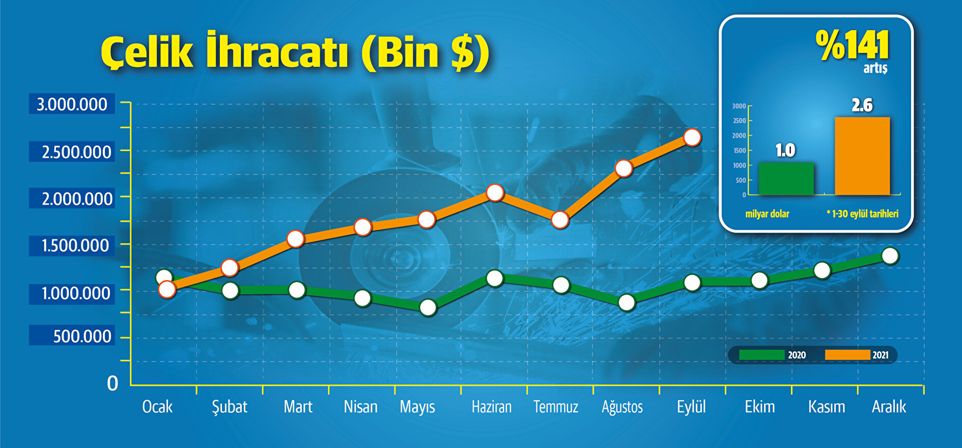 Türkiye’nin ihracatı eylül ayında yıllık bazda yüzde 30 artışla 20,8 milyar dolara yükselirken, zirveye 2,6 milyar dolarlık ihracat ile çelik sektörü yerleşti. Trump döneminde uygulanan korumacı vergiler nedeniyle Latin Amerika, Uzak Doğu, Güney Asya gibi alternatif pazarlara yönelen çelik sektörü ihracatını yüzde 141 oranında artırma başarısı gösterdi. Sektörün bundan sonraki hedefi, pazar paylarını daha da arttırmak.
