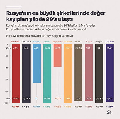 Rus Lukoil’in hisse değeri yüzde 99, Gazprom Neft’in hisse değeri yüzde 38 düştü. Rusya’nın en büyük perakende şirketlerinden Magnit’in hisseleri yüzde 99’dan fazla değer kaybederek 9 dolardan 0,018 dolara düşerken, X5 Retail şirketinin hisseleri de 10,6 dolardan 0,31 dolara gerileyerek yüzde 97 seviyesini gördü. Tüm bu kayıplar bireysel yatırımcının tepkisi olarak değerlendiriyor.
