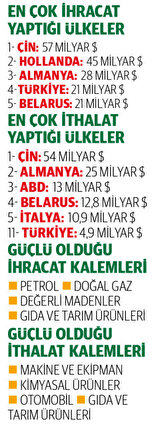 - Rusya'nın ticaretinde ise 282 milyar dolar ile Avrupa başı çekiyor. Onu 228 milyar dolar ile Asya-Pasifik ve 14.5 milyar dolar ile Afrika takip ediyor. Rusya dünyanın önemli bir ham madde yatağı olarak da biliniyor. Dolayısı ile dünyada bir çok sektörün ihtiyaç duyduğu değerli madenler çoğunlukla Rusya tarafından sağlanıyor.