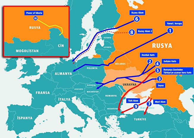 - Rusya, doğal gazı Avrupa’ya Kuzey Akım, Yamal-Europe ve Kardeşlik gibi birkaç ana boru hattıyla yolluyor. Avrupa’da Rusya’ya en bağımlı ülke Finlandiya. 2020 verilerine göre Finlandiya’nın doğal gazının yüzde 94’ü Rusya’dan. Avrupa’nın en büyük ekonomisi Almanya ise doğal gazın yüzde 49’unu Rusya’dan temin ediyor. İtalya’da bu oran yüzde 46. AB ülkelerinin Rus gazından faydalanma ortalaması yüzde 32.