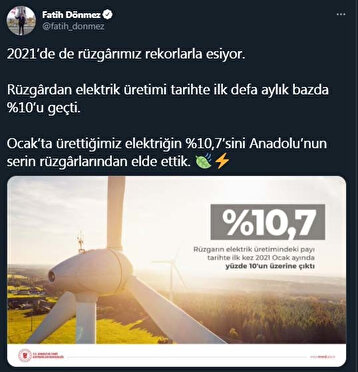 Enerji ve Tabii Kaynaklar Bakanı Fatih Dönmez, Twitter hesabından yaptığı paylaşımda, "2021'de de rüzgarımız rekorlarla esiyor. Rüzgardan elektrik üretimi tarihte ilk defa aylık bazda yüzde 10'u geçti. Ocakta ürettiğimiz elektriğin yüzde 10,7'sini Anadolu'nun serin rüzgarlarından elde ettik." ifadelerini kullandı.