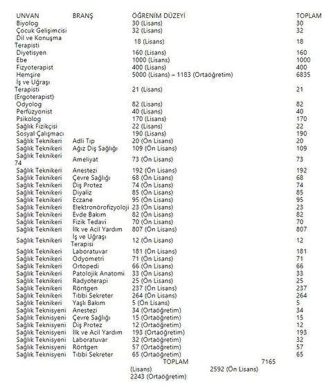 Belirlenen 12 bin kadrodan 6 bin 835’i hemşire, bini ebe ve 3 bini sağlık teknisyeni ile sağlık teknikerinden oluşacak.