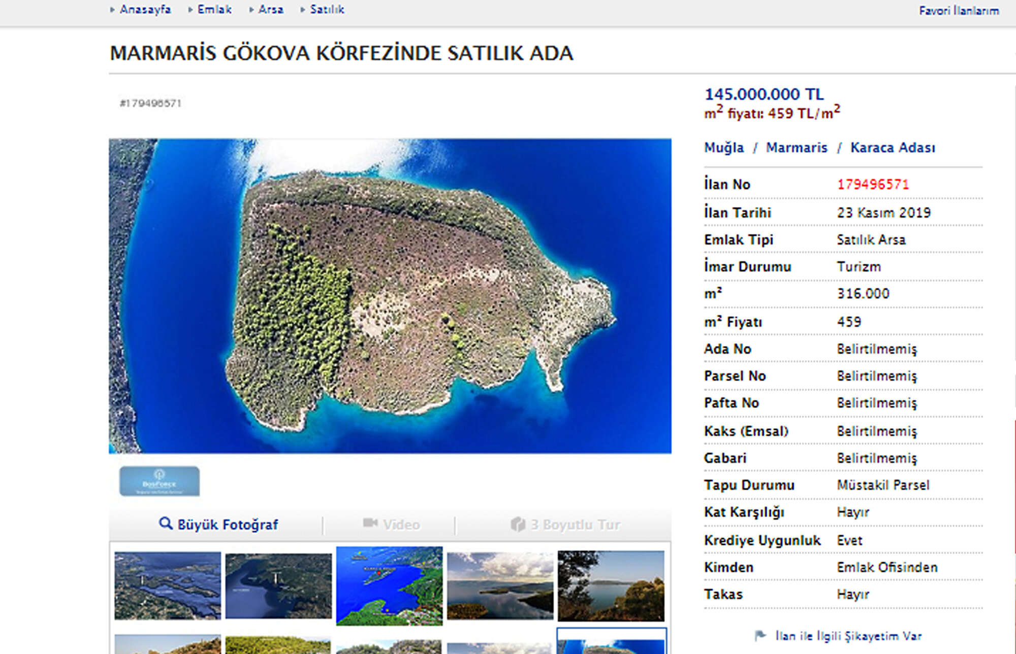 Mülk sahibi adına adanın satışını takip eden İstanbul merkezli Bosforce Emlak Geliştirme ve Pazarlama şirketi yönetici ortağı Uğur Özcan, Gökova Körfezi'nde yer alan adanın krediye uygun olduğunu söyledi.