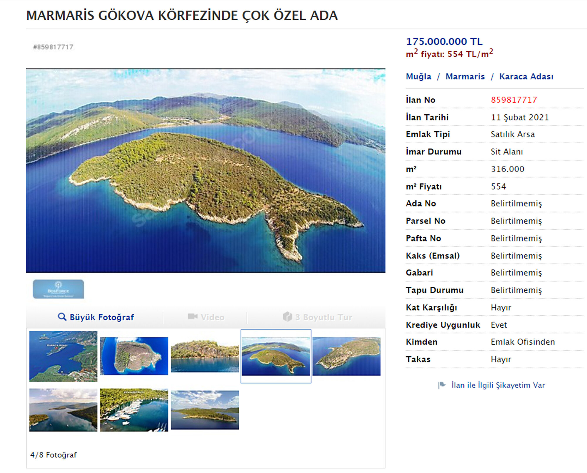 Muğla'nın Gökova Körfezi'ndeki 316 bin metrekarelik Karaca Adası, yaklaşık 2 yıldır internette yeni sahibini arıyor. İlk olarak 210 milyon TL'ye satışa çıkarılan, şubat ayında 175 milyon TL'ye düşürülen adanın fiyatı, geçen ay 50 milyon TL artırılarak 225 milyon TL'ye çıktı.