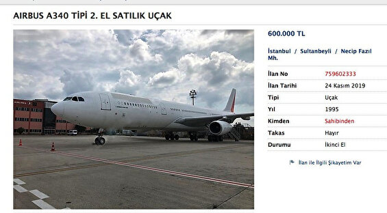 Airbus A340 tipi uçak için 600 bin lira isteniyor.