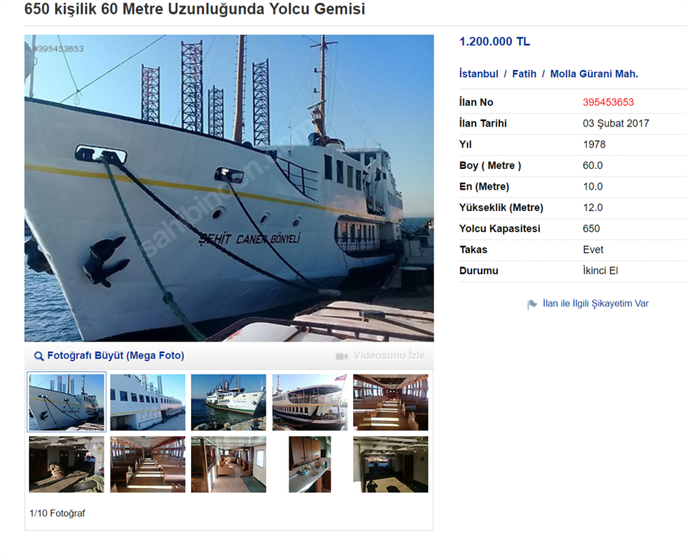 Deniz İşletme Müdürlüğü'nden dört yıl önce ihale ile satın alınan Şehit Caner Gönyeli yolcu vapuru, 1 milyon 200 bin lira bedelle bir internet sitesi üzerinden 3 Şubat'ta satışa çıkarıldı. Hürriyet'te yer alan habere göre vapura şu ana kadar yerli-yabancı turizm işletmelerinin ve mimarların talip olduğu belirtildi.