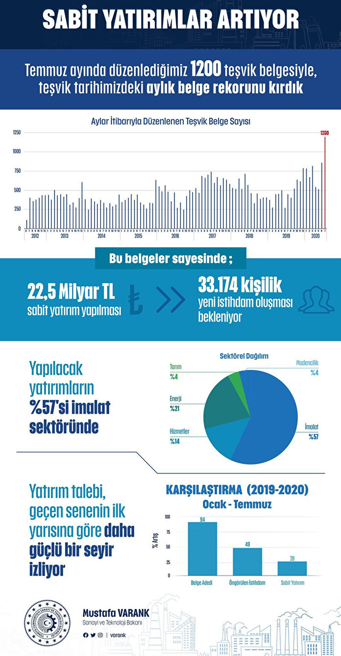 Sanayi ve Teknoloji Bakanı Mustafa Varank, Twitter hesabından yaptığı açıklamada, "Yatırım iştahı temmuzda artmaya devam etti. Düzenlediğimiz bin 200 teşvik belgesiyle yeni bir zirveye ulaştık" dedi.
