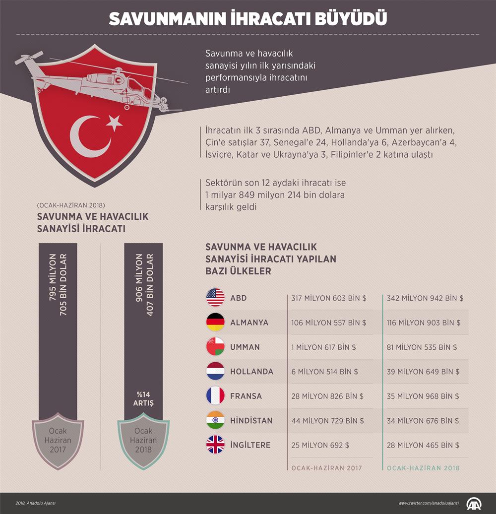 Savunma ve havacılık sanayisinin ihracatı yılın ilk yarısında yaklaşık yüzde 14 arttı. Ülke savunmasını Türk savunma sanayisi ürünleriyle güçlendiren Azerbaycan'a ihracat yaklaşık 4 katına çıktı. Geçen yılın ilk yarısındaki 5 milyon 697 bin dolarlık ihracat 20 milyon 676 bin dolara ulaştı.