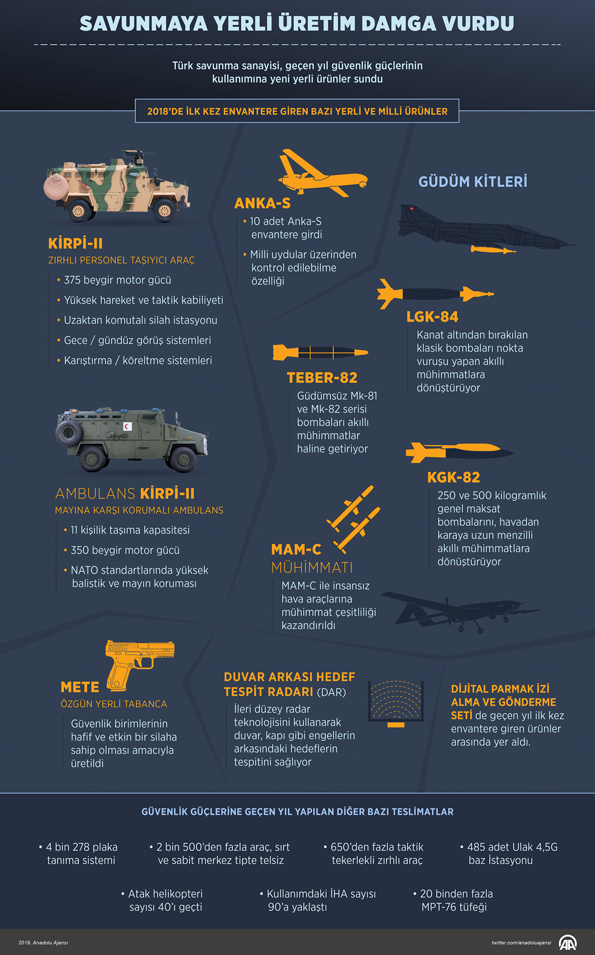 Güvenlik güçlerinin envanterine giren yerli ürünlere geçen yıl yenileri eklendi. Kirpi-2, Mayına Karşı Korumalı Ambulans Kirpi, Anka-S İHA, LGK-84, Teber-82 ve KGK-82 güdüm kitleri ilk kez envantere girdi. Kargu Döner Kanatlı Vurucu İHA, MAM-C mühimmatı, özgün yerli tabanca Mete, Duvar Arkası Hedef Tespit Radarı, Dijital Parmak İzi Alma ve Gönderme Seti envantere yeni giren savunma sanayisi ürünleri arasında yer aldı.