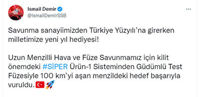 Başkan Demir, "Savunma sanayiimizden Türkiye Yüzyılı’na girerken milletimize yeni yıl hediyesi!" başlığıyla paylaştığı videoda SİPER Ürün-1 Sisteminden Güdümlü Test Füzesiyle hedefi başarıyla vurduğu görülüyor.