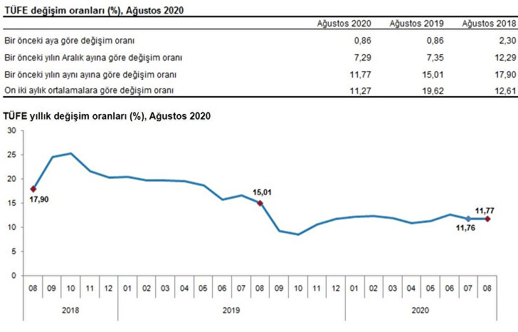 Türkiye İstatistik Kurumu (TÜİK), 2020 yılı Ağustos ayı enflasyon rakamlarını açıkladı. Enflasyon ağustosta yüzde 0,86 artarken, yıllık bazda yüzde 11,77 oldu.