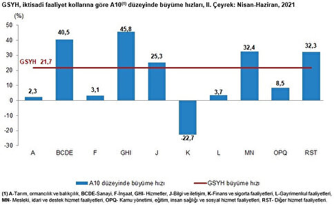 GSYH'yi oluşturan faaliyetler incelendiğinde; 2021 yılı ikinci çeyreğinde bir önceki yıla göre zincirlenmiş hacim endeksi olarak; hizmetler %45,8, sanayi %40,5, mesleki, idari ve destek hizmet faaliyetleri %32,4, diğer hizmet faaliyetleri %32,3, bilgi ve iletişim faaliyetleri %25,3, kamu yönetimi, eğitim, insan sağlığı ve sosyal hizmet faaliyetleri %8,5, gayrimenkul faaliyetleri %3,7, inşaat %3,1 ve tarım, ormancılık ve balıkçılık %2,3 arttı. Finans ve sigorta faaliyetleri ise %22,7 azaldı.