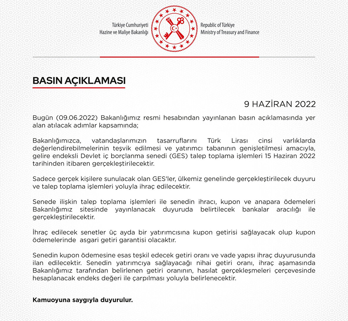 Hazine ve Maliye Bakanlığı, vatandaşları ekonomide atılacak yeni adımları açıkladı. Bakanlıktan yapılan açıklamada, "Bakanlığımızca, vatandaşlarımızın tasarruflarını Türk Lirası cinsi varlıklarda değerlendirebilmelerinin teşvik edilmesi ve yatırımcı tabanının genişletilmesi amacıyla, gelire endeksli Devlet iç borçlanma senedi (GES) talep toplama işlemleri 15 Haziran 2022 tarihinden itibaren gerçekleştirilecektir." denildi.