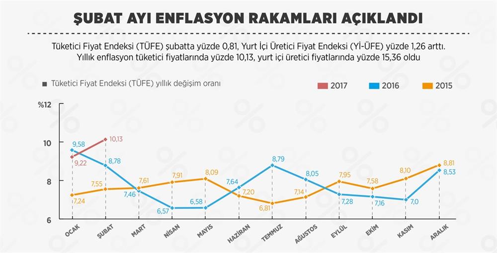 - TÜFE'de 2017 yılı Şubat ayında bir önceki aya göre yüzde 0,81, bir önceki yılın Aralık ayına göre yüzde 3,29, bir önceki yılın aynı ayına göre yüzde 10,13 ve on iki aylık ortalamalara göre yüzde 7,88 artış gerçekleşti.