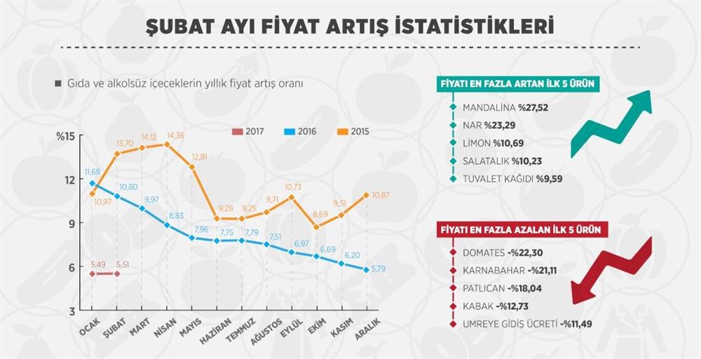 Tüketici fiyatları bazında şubatta en fazla düşen ürünlerin başında yüzde 22,3 domates olurken, en yüksek fiyat artışı yüzde 27,52 ile mandalina oldu.
