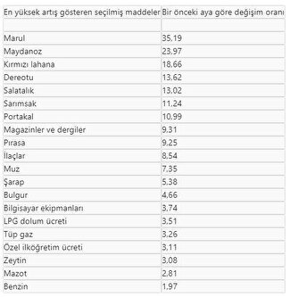 - Şubatta fiyatı en çok artan diğer ürünler arasında yüzde 13,62 ile dereotu, yüzde 13,02 ile salatalık, yüzde 11,24 ile sarımsak, yüzde 10,99 ile portakal, yüzde 9,31 ile magazinler ve dergiler, yüzde 9,25 ile pırasa ve yüzde 8,54 ile ilaçlar sıralandı.