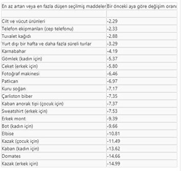 Geçen ay en fazla fiyat düşüşü ise yüzde 14,99 ile erkek kazağında gerçekleşti. Bunu yüzde 14,66 ile domates, yüzde 13,62 ile kadın kabanı, yüzde 11,49 ile çocuk kazağı, yüzde 10,81 ile elbise, yüzde 9,66 ile kadın botu, yüzde 9,39 ile erkek montu izledi.