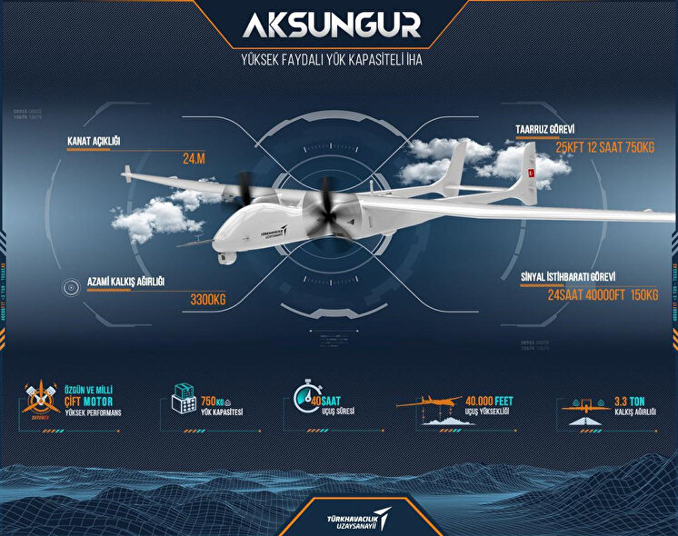 - 40 bin feet irtifaya çıkabilen ve 40 saate kadar havada kalabilen Aksungur, en zorlu operasyonların tamamlanabilmesine imkan veren motor yapısına da sahip bulunuyor.