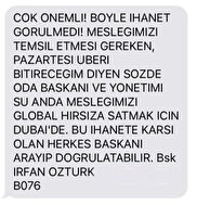 Dubai seyahatine ilişkin İstanbul Taksiciler Birliği tüm üyelerine bu ziyareti deşifre eden bir mesaj gönderdi. 'Böyle ihanet görülmedi' ifadeleri ile başlanan mesajda 'UBER'i bitireceğim diyen Oda başkanı ve yönetimi mesleği global hırsızlara satmak için Dubai'de'' denildi. Mesajı alan yüzlerce taksici yapılan görüşmeye tepki gösterdi.