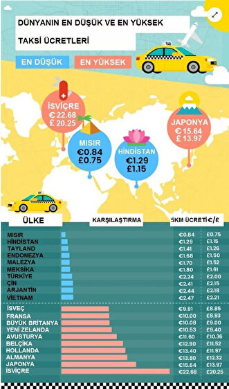 Dünyada taksi ücretinin en pahalı olduğu ülke açık ara İsviçre. Haziran ayı fiyatlarına göre 22.68 euro ödeyen İsviçreliden sonra taksiye en yüksek ücreti 15.64 euro ise Japonlar ödüyor.