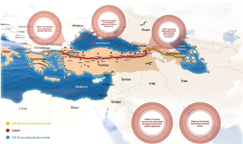 TANAP Projesi, Güney Kafkasya Bora Hattı ( SCP ) ve Trans Adriyatik Boru Hattı (TAP ) ile Güney Gaz koridorlarının temelini oluşturuyor. Azerbaycan'ın Hazar Denizi'ndeki Şah Deniz-2 Gaz Sahası ve Hazar Denizi'nin güneyindeki diğer sahalarda üretilen doğal gazın Türkiye'ye ve Avrupa'ya taşınması amaçlanıyor.