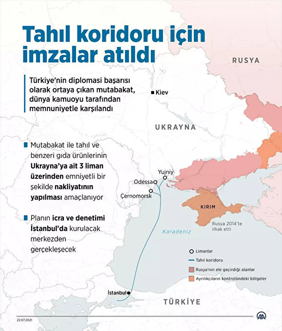 Cumhurbaşkanı Recep Tayyip Erdoğan'ın himayelerinde, bugün İstanbul'da, Türkiye, Rusya, Ukrayna ve Birleşmiş Milletler (BM) arasında "Tahıl ve Yiyecek Maddelerinin Ukrayna Limanlarından Emniyetli Sevki Girişimi Belgesi" imzalanmıştı.
