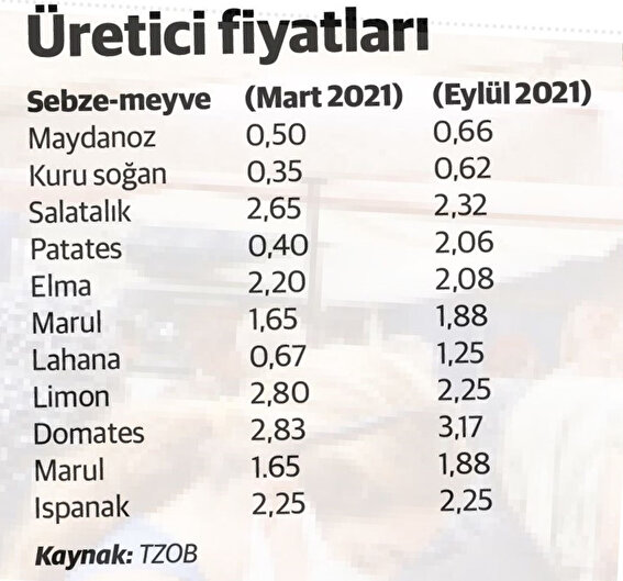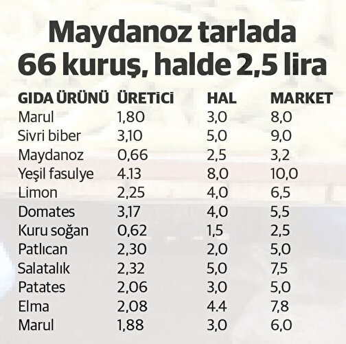 Mutfakların vazgeçilmezi maydanozun fiyatı, son 6 ayda tarlada 50 kuruştan 66 kuruşa çıktı. Başka bir ifadedeyle üretici sattığı bir demet maydanozdan 16 kuruş kazanırken, aynı ürün hale geldiğinde 2,5 liradan etiketleniyor. Halden 2.5 liraya çıkan üren market raflarında 3-3,5 lira arasında satışa çıkıyor. Benzer bir durum kuru soğanda da söz konusu. Bu yıl martta tarlada 35 kuruş olan kuru soğan eylül sonunda 62 kuruşa yükselirken, halde 1,5 lira, marketlerde 2,5 liradan yerini alıyor. Ispanak fiyatı aynı dönemde üreticide 2 lira 25 kuruşla aynı kalırken, marul 1,65 liradan 1,88 liraya, domates 2,8 liradan 3,17 lira oldu.