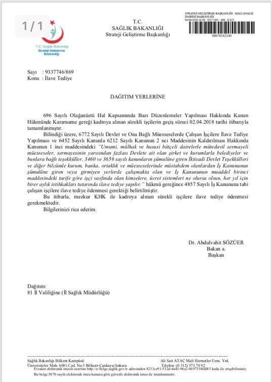 Sağlık Bakanlığı 81 il valiliğine gönderdiği yazıda kadroya geçişi gerçekleştirilen taşeron işçilere ilave tediye ödenmesi gerektiğini belirtti.