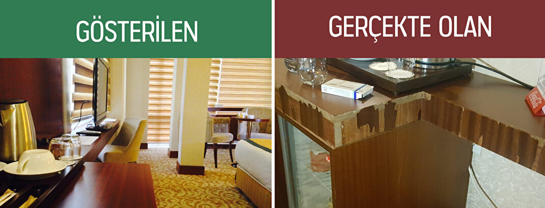 Tatilciler sadece sahte site ve görseller üzerinden mağduriyet yaşamıyor. Tatil siteleri ve otellerin web siteleri üzerinden satın aldıkları tatil paketlerinde hamam, sauna, spa, oyun parkı, açık büfe gibi farklı donatılara aldanarak tercihi yapan tatilciler otellere gittiğinde büyük bir hayal kırıklığı yaşayarak tatilini arzu ettiği gibi sonlandıramıyor.