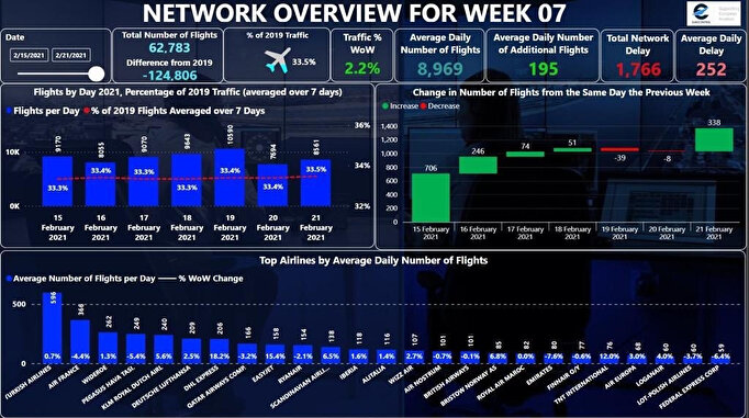Avrupa Hava Seyrüsefer Emniyeti Teşkilatının (EUROCONTROL) 15-21 Şubat arasındaki uçuş trafiği raporunu göre, THY günlük ortalama 596 uçuşla Avrupalı rakiplerini geride bıraktı.
