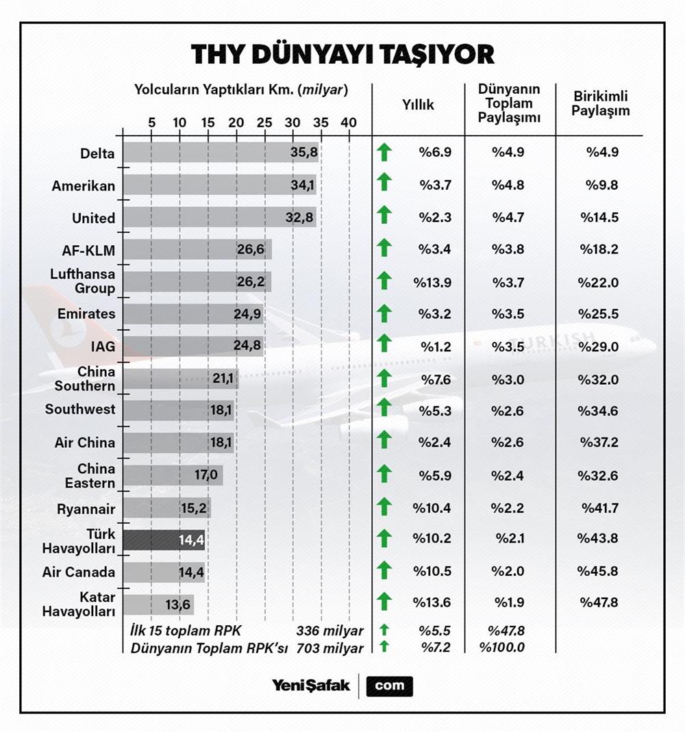 ICAO raporunda, THY için, "Türk Havayolları güçlü bir şekilde büyümeyi sürdürdü ve 13. sırada yer aldı" ifadeleri kullanıldı.