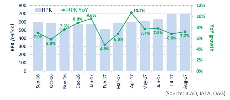 Uluslararası Sivil Havacılık Örgütü'nün (ICAO) Ekim ayı raporuna göre, dünya yolcu trafiği Ağustos ayında yüzde 7.2 büyüme kaydederek, bir önceki aya göre 4.4 puan arttı.