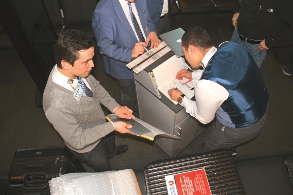 - Yolcular, yanlarındaki diz üstü bilgisayar, tablet, e-kitap okuyucular ve oyun konsollarını özel güvenlik şirketi görevlilerine teslim ediyor. İşlemlerin ardından üzerine etiket yapıştırılan ve özel kutulara konulan eşya, uçak altına götürülüyor.