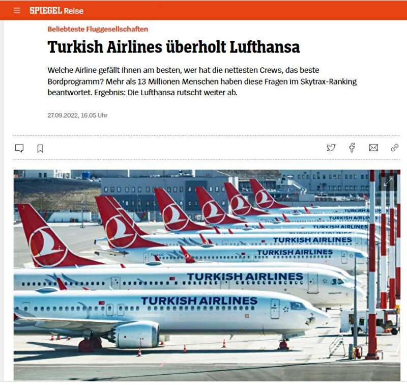 Avrupa'nın en iyi hava yolu şirketi seçilen THY'nin başarısı Alman medyasında yankı buldu. Alman gazetesi Spiegel, "THY, Lufthansa'yı geçti" diyerek duyurdu.