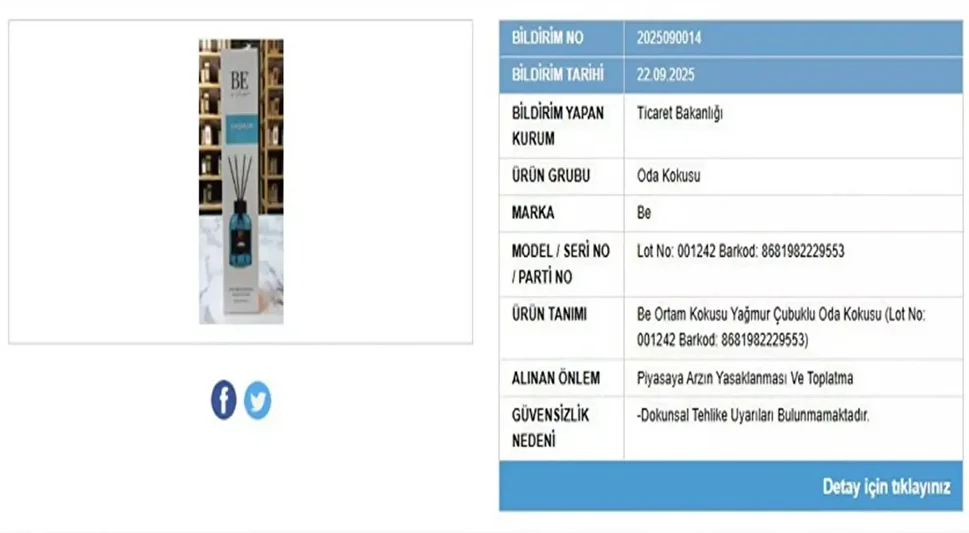 üzerinden ilan edildi. Yapılan son duyuruda, “Be” markasına ait “Ortam Kokusu Yağmur Çubuklu Oda Kokusu” adlı ürünün, taşıdığı kimyasal ve yangın riski nedeniyle güvensiz bulunduğu bildirildi. Ürünün üzerinde dokunsal tehlike uyarı işaretlerinin yer almaması da risk unsurları arasında sayıldı.