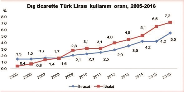 TL’nin ithalat içindeki payı da giderek artış gösteriyor. 2010’da 185.5 milyar dolarlık ithalatın yüzde 3.1’i TL ile yapılırken, 2011’de 240.8 milyar dolarlık ithalatın yine yüzde 3.1’i TL ile gerçekleştirildi. TL’nin ithalat içindeki payı, 2012’de yüzde 4, 2013’te yüzde 4.5, 2014’te yüzde 5.1, 2015’de yüzde 6.5, 2016’da yüzde 7.2 oldu. 2017 yılı Ocak-Kasım döneminde 210 milyar 703 milyon dolarlık ithalatın yüzde 7.8’ine karşılık gelen 16 milyar 463 milyon dolarlık kısmı TL cinsinden gerçekleştirildi.