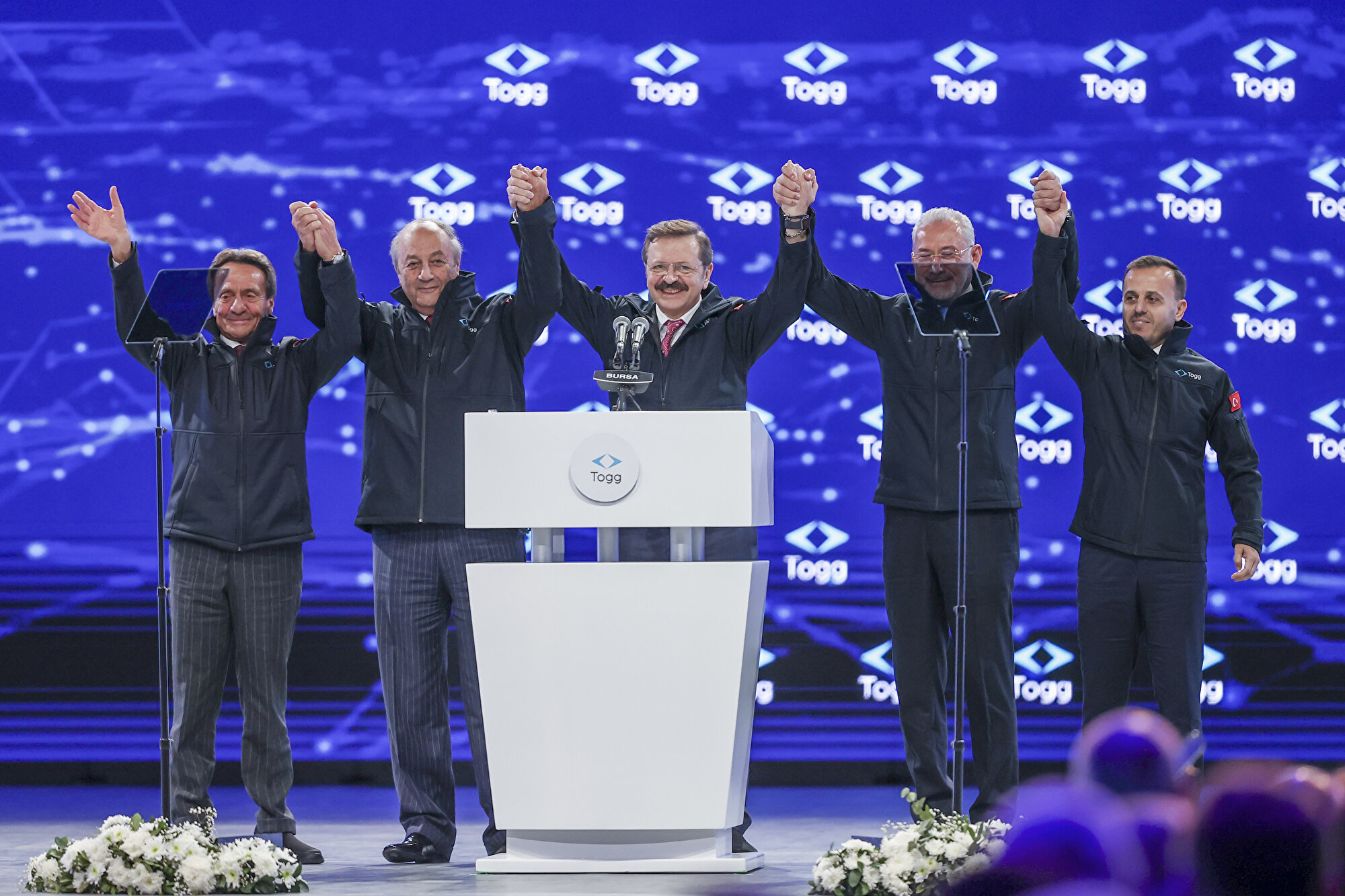 Rifat Hisarcıklıoğlu, Togg'un ortaya çıkmasında emeği geçen bakanlara ve bakanlıklara, oda ve borsa başkanlarına, iş dünyası temsilcilerine ve sivil toplum kuruluşu yöneticilerine teşekkür etti.