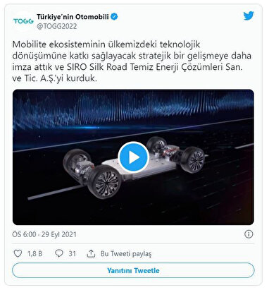 TOGG'un resmi Twitter hesabından yapılan paylaşımda, SIRO Silk Road Temiz Enerji Çözümleri San. ve Tic. AŞ'nin, mobilite ekosisteminin Türkiye'deki teknolojik dönüşümüne katkı sağlayacağı belirtildi.
