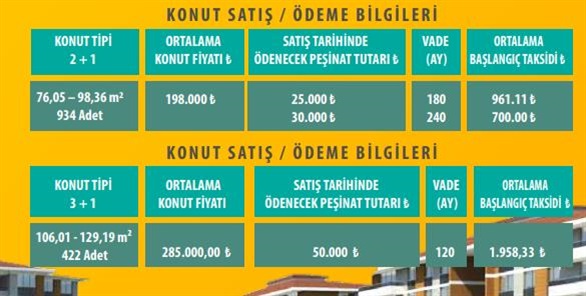 - Satışa sunulan konutların fiyatının 198 bin TL ve en düşük taksit tutarının 700 TL olduğunu belirten Turan, konut sahibi olmak isteyen vatandaşların en geç29 Haziran 2018tarihine kadar başvurularını yapmaları gerektiğini belirtti.