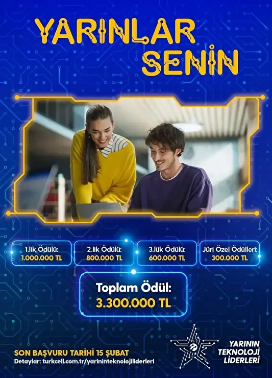- Son başvuru tarihi 15 Şubat 2026 olan yarışmanın final etabı 23 – 26 Mayıs 2026 tarihleri arasında düzenlenecek. Türkiye’de üniversitelilere yönelik gerçekleştirilen en kapsamlı proje yarışması olan “Yarının Teknoloji Liderleri”nde birinci olan proje 1 milyon TL, ikinci 800 bin TL, üçüncü 600 bin TL ile ödüllendirilecek. Ayrıca jüri tarafından belirlenecek 3 ayrı proje 300’er bin TL’nin sahibi olacak.