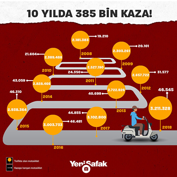 TÜİK tarafından açıklanan verilere göre motosikletli kazaların oranı 2008'e göre son 10 yıl içinde yüzde 130'u artarken 2018 yılında yapılan kaza sayısı ise 50 bine yaklaşmış durumda. Sürücü tarafında en fazla ölüm oranı da otomobilden sonra motosiklette gerçekleşiyor.