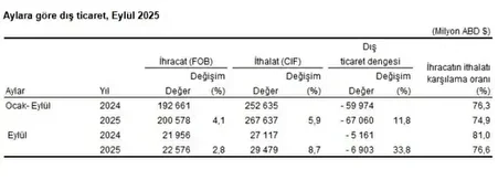 Eylül ayında dış ticaret açığı bir önceki yılın aynı ayına göre yüzde 33,8 artarak 5 milyar 161 milyon dolardan, 6 milyar 903 milyon dolara yükseldi. İhracatın ithalatı karşılama oranı 2024 Eylül ayında yüzde 81 iken, 2025 Eylül ayında yüzde 76,6'ya geriledi. Ocak-eylül döneminde dış ticaret açığı yüzde 11,8 artarak 59 milyar 974 milyon dolardan, 67 milyar 60 milyon dolara yükseldi. İhracatın ithalatı karşılama oranı 2024 Ocak-Eylül döneminde yüzde 76,3 iken, 2025 yılının aynı döneminde yüzde 74,9'a geriledi.